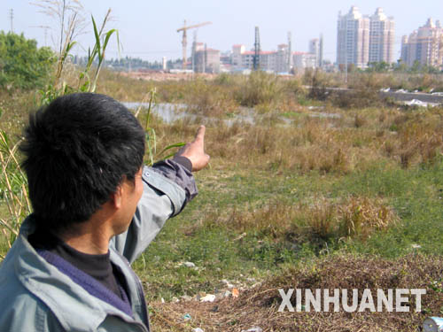 這是開平市長沙街道橋尾村一村民在向記者反映當(dāng)?shù)氐暮惐さ禺a(chǎn)項(xiàng)目的違規(guī)情況(2008年1月攝)。新華社記者 梁鋼華 攝