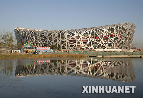 “鳥巢”倒映在水中。北京2008年奧運(yùn)會主會場――國家體育場(“鳥巢”)鋼筋混凝土結(jié)構(gòu)、鋼結(jié)構(gòu)、膜結(jié)構(gòu)三大結(jié)構(gòu)工程日前完工,并開始安裝座椅。 新華社發(fā)