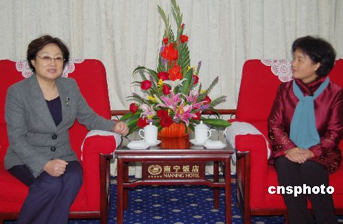 2月2日晚,在僑鄉廣西遭遇嚴重雨雪冰凍災害急需援助之際,中國國務院僑辦主任李海峰女士(左)一行從北京飛赴南寧進行慰問,并與廣西自治區人大常委會副主任、廣西紅十字會會長劉新文進行會談,隨后李海峰代表國務院僑辦和海外僑胞向廣西災區民眾捐助一百萬元人民幣。 中新社發 劉萬強 攝