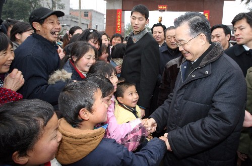 資料圖片:2月6日,中共中央政治局常委、國務院總理溫家寶結束貴州的考察工作,立即趕到江西災區,指導抗災救災和災后恢復生產工作,看望慰問干部群眾。這是溫家寶在撫州市臨川區云山鎮圳上村看望慰問受災村民。新華社記者 姚大偉 攝