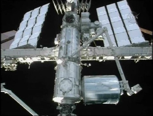 2008年2月13日 歐洲“哥倫布”實驗艙被成功安置到國際空間站上 這張2月12日的視頻截圖顯示的是歐洲“哥倫布”實驗艙(右下)已經(jīng)成功地被安置到國際空間站上。經(jīng)過近8小時的太空行走,美國“阿特蘭蒂斯”號航天飛機上的兩名宇航員于美國東部時間11日成功地將重達(dá)10噸的“哥倫布”實驗艙安置到國際空間站上。 新華社/路