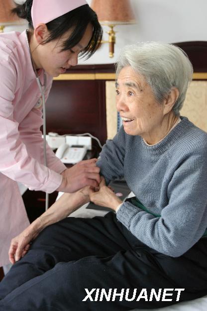 圖片說明:1月25日,在養老基地頤年山莊內,一名護理員在為一位退休老人測量血壓。近日,中國資產經營管理公司利用央企閑置資產改造建立的首家養老基地――城通頤年山莊在北京落成,并迎來了首批來此居住養老的退休老人。2007年6月,在軍工企業改制和社會老齡化的大背景下,中資公司投資3000萬元,將閑置多年的北京燕京汽車廠一分廠舊廠房加以改造,發展養老產業,并積極探索多種養老模式。此舉既盤活了企業資產,又為社會養老開辟了新路子。(新華社記者 李明放 攝)