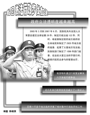 推進依法行政,嚴格行政執法是核心,責任追究是關鍵。五年來,國務院不斷深化行政執法體制改革,全面推廣相對集中行政處罰權制度,努力探索綜合執法試點。各地方按照國務院的要求,積極開展這兩項工作,取得了新成效。據統計,除經國務院批準的82個相對集中行政處罰權試點城市外,還有190個市級政府和804個縣級政府開展了相對集中行政處罰權工作;183個市級政府和830個縣級政府開展了綜合執法試點工作。相對集中行政處罰權和綜合執法的領域已從最初的城市管理逐步擴展到文化、旅游、礦山安全、農業、林業、水利、交通等領域,有效地整合了分散的執法力量,較好地解決了多頭執法、相互扯皮、執法擾民的問題,杜絕了“七八頂大蓋帽管一頂破草帽”的現象。