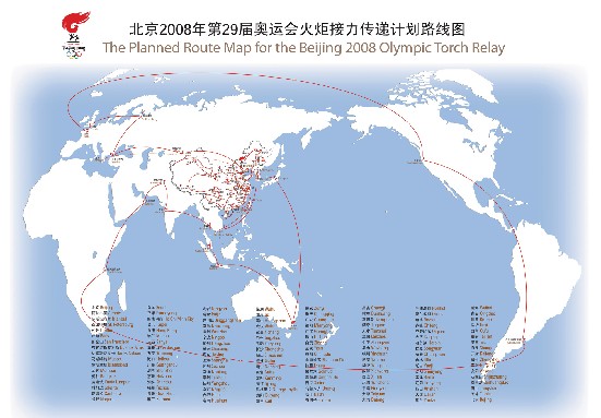 4月26日,北京2008年第29屆奧運會火炬接力傳遞計劃路線和火炬發(fā)布儀式在北京中華世紀(jì)壇舉行。圖為北京奧組委公布的北京奧運會火炬接力傳遞計劃路線圖。新華社發(fā)