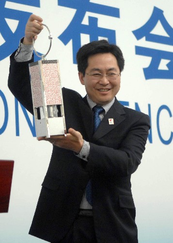 1月16日,北京奧組委火炬接力中心新聞發言人曲瑩璞展示火種燈。 新華社記者 羅曉光 攝