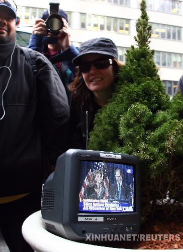 3月12日,在斯皮策位于紐約市的辦公地點外,未能進入樓內的記者只能在路邊觀看斯皮策辭職的電視直播。 當日,因卷入召妓丑聞的美國紐約州州長斯皮策正式宣布辭職。 新華社記者侯俊攝