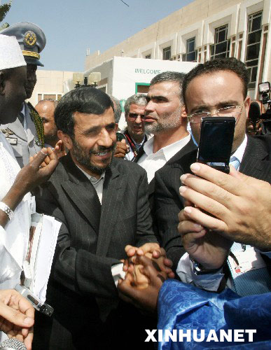 3月13日,在塞內加爾首都達喀爾舉行的第11次伊斯蘭國家首腦會議開幕式上,伊朗總統艾哈邁迪-內賈德(中)與支持者握手。 新華社記者王迎攝