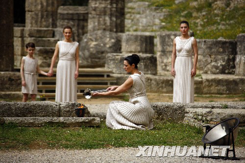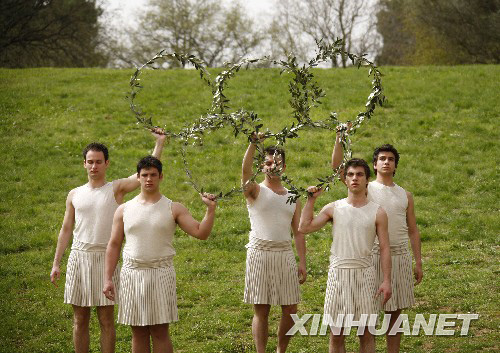 3月23日,扮演男祭司的演員們在彩排儀式上舉起五環(huán)。當(dāng)日,北京奧運(yùn)會(huì)圣火采集儀式在奧林匹亞進(jìn)行最后一次彩排。新華社記者畢明明攝