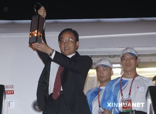 4月12日,北京奧組委執行副主席劉敬民(左)手持火種燈步出機艙。 當日,運送北京奧運圣火的專機從阿根廷首都布宜諾斯艾利斯飛抵坦桑尼亞達累斯薩拉姆。13日,北京奧運會火炬境外第八站的傳遞將在這座坦桑尼亞的最大城市舉行。 新華社記者戚恒攝