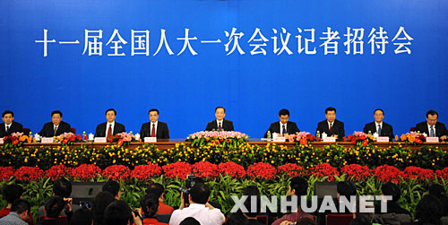 3月18日,國務(wù)院總理溫家寶和副總理李克強、回良玉、張德江、王岐山在北京人民大會堂與中外記者見面,并回答記者提問。 新華社記者王建華攝