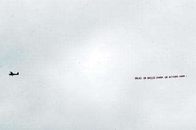 4月14日,西雅圖上空飛機(jī)拖出抗議標(biāo)語:“達(dá)賴:你的微笑很吸引人,但是你的行動(dòng)很傷害人!保―alai: your smiles charm but your actions harm)