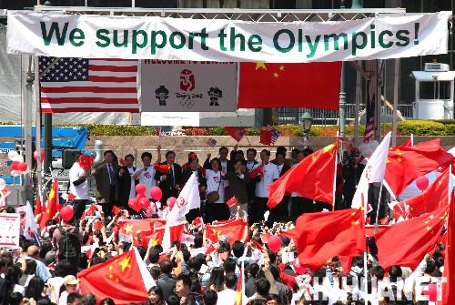 5月4日,數千名來自紐約及美國各地的中國留學生、華人華僑聚集在紐約弗利廣場,舉行主題為支持北京奧運的和平集會,表達“和平奧運”、“體育不應與政治掛鉤”的心聲。新華社記者侯俊攝 |
