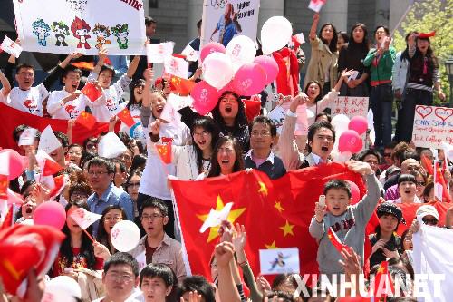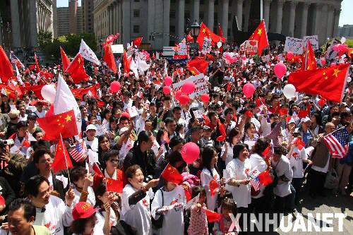 5月4日,數千名來自紐約及美國各地的中國留學生、華人華僑聚集在紐約弗利廣場,舉行主題為支持北京奧運的和平集會,表達“和平奧運”、“體育不應與政治掛鉤”的心聲。新華社記者侯俊攝
