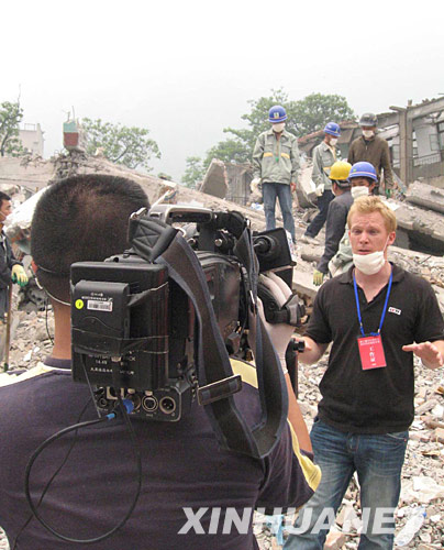 5月17日,一名外國記者(前右)在北川中學廢墟上進行現場報道。 新華社記者 徐壯志 攝