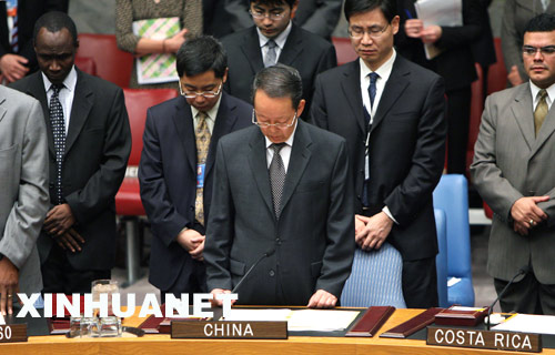 5月20日,在美國紐約聯合國總部舉行的聯合國安理會會議上,中國常駐聯合國代表王光亞(前中)與安理會成員集體默哀,對中國四川汶川大地震遇難者表示哀悼。 新華社記者侯俊攝