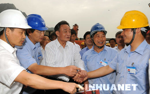 5月28日,中共中央政治局常委、全國人大常委會委員長吳邦國來到受災(zāi)嚴(yán)重的綿竹市漢旺鎮(zhèn)、平武縣平通鎮(zhèn)等地察看災(zāi)情,看望企業(yè)職工和學(xué)校師生,慰問災(zāi)區(qū)干部群眾和來自四面八方的救援人員。這是吳邦國在東方汽輪機廠漢旺基地與從廢墟中被救出的主機一分廠廠長喻剛親切握手。 新華社記者饒愛民攝