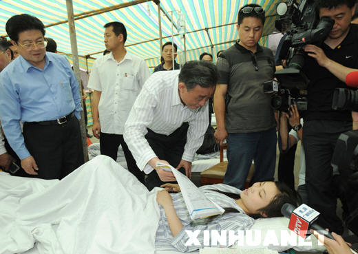 5月28日,中共中央政治局常委、全國人大常委會委員長吳邦國來到受災(zāi)嚴(yán)重的綿竹市漢旺鎮(zhèn)、平武縣平通鎮(zhèn)等地察看災(zāi)情,看望企業(yè)職工和學(xué)校師生,慰問災(zāi)區(qū)干部群眾和來自四面八方的救援人員。這是吳邦國在德陽市第一人民醫(yī)院的帳篷病房,叮囑漢旺鎮(zhèn)應(yīng)屆高三畢業(yè)生范琴好好養(yǎng)傷,祝愿她在高考中取得好成績。 新華社記者黃敬文攝