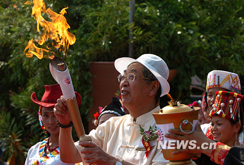 6月11日,全國人大常委會原副委員長許嘉璐點燃“中華56民族之歌”音樂火炬。