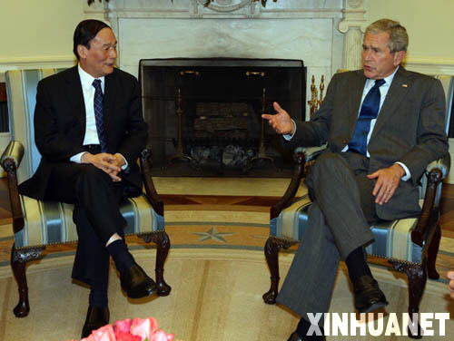 資料圖片:6月18日,美國(guó)總統(tǒng)布什在華盛頓白宮會(huì)見(jiàn)前來(lái)出席第四次中美戰(zhàn)略經(jīng)濟(jì)對(duì)話的中國(guó)國(guó)家主席胡錦濤的特別代表、國(guó)務(wù)院副總理王岐山。 新華社記者姚大偉攝