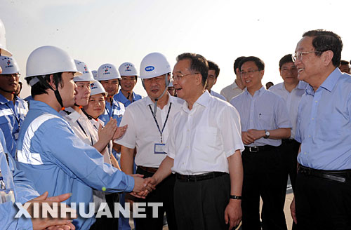 7月4日至6日,中共中央政治局常委、國務院總理溫家寶在江蘇、上海就經濟運行情況進行調查研究。這是7月5日,溫家寶在上海洋山深水港考察時親切看望港口建設人員。新華社記者 饒愛民 攝