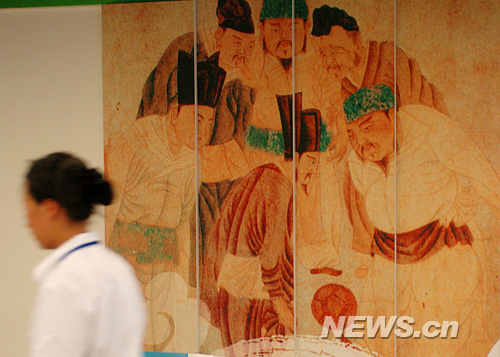 7月3日,記者走進北京奧運會主新聞中心(MPC),除了工作人員緊張有序的忙碌外,印象最深的,就是那些具有中國元素的內部裝飾了。這是工作人員走過一面有傳統人物壁畫裝飾的墻面。新華網 陳競超 攝