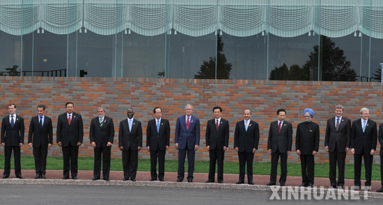 7月9日,國家主席胡錦濤在日本北海道洞爺湖出席八國集團同發(fā)展中國家等領(lǐng)導(dǎo)人對話會議。這是領(lǐng)導(dǎo)人集體合影。新華社記者 樊如鈞 攝