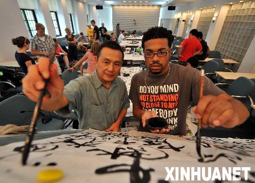 6月24日,北京奧運會媒體運行海外志愿者柯凱文(右)向老師高原請教中國書法。當日,來自美國愛荷華大學的24名北京奧運會媒體運行海外志愿者在清華大學新聞與傳播學院體驗中國書法。這些志愿者是22日到達北京的,他們將在清華大學參加為期一周的中國文化培訓,之后與其他292名媒體運行海外志愿者參加北京奧組委組織的場館及崗位培訓。 新華社記者羅曉光攝