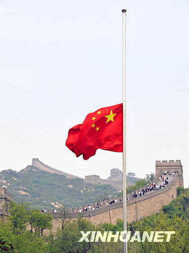 5月19日,北京八達嶺長城游覽區為四川汶川大地震的遇難同胞下半旗志哀。 新華社記者 劉浦泉攝