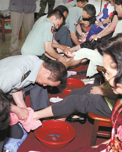 臺陸軍六軍團在軍中推動孝道,希望官兵透過為母親洗腳體驗母親的辛勞。圖為六軍團官兵為當選模范母親跪地洗腳的場景,其中六軍團政戰主任曾有福少將(左)穿軍服下跪為母洗腳。