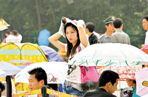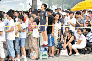 排在第一位的是一個名叫徐永恒的東北小伙。記者昨日下午見到他時,他和同伴已經足足等待了30多個小時。記者看到,在徐永恒身邊,除了一張稍顯破舊的涼席外,身邊是五六個空礦泉水瓶。與身邊打著傘戴著墨鏡來來往往的帥哥美女不同,25歲的徐永恒一臉黝黑,“我們本來很白的,都是這兩天給曬的”。
