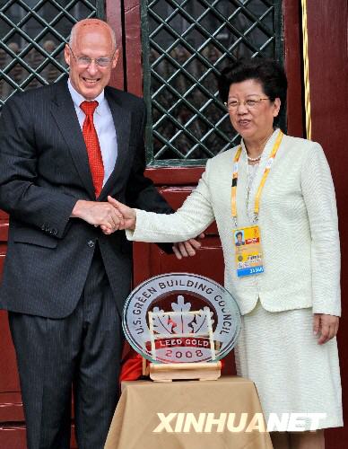 新華網(wǎng)北京8月13日奧運(yùn)專電(記者汪涌)美國(guó)財(cái)政部長(zhǎng)保爾森13日專程來(lái)到北京奧運(yùn)村,代表美國(guó)綠色建筑協(xié)會(huì)為北京奧運(yùn)村頒發(fā)綠色環(huán)保金獎(jiǎng)“能源與環(huán)境設(shè)計(jì)先鋒金獎(jiǎng)”。