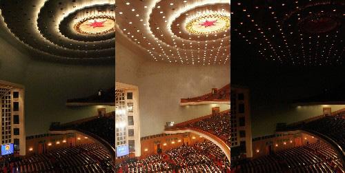 人民大會堂活動場所空間大,舉行大型活動時,工作人員根據現場客人入場情況按階梯式開啟照明燈,待客人大批入場時再打開全部照明燈,此舉可以節約大量照明用電。這組拼版照片顯示的是3月10日,十一屆全國人大一次會議第三次全體會議時人民大會堂內的照明情況。左圖:會前,出席人員正在入場,照明燈部分開啟。中圖:會中,照明燈全部開啟。右圖:會后,出席人員離場,照明燈逐漸關閉,僅為整理會場的工作人員保留基本照明。新華社記者尹棟遜攝