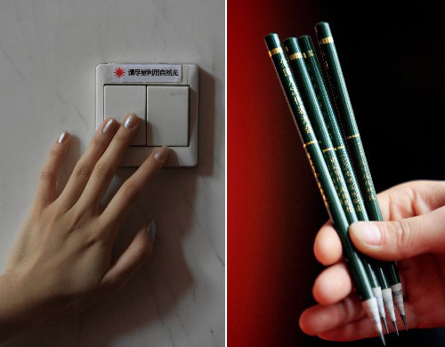 (資料圖)左圖:人民大會堂內一處照明燈開關旁貼著“請盡量利用自然光”的提示(3月10日攝)。類似的提示隨處可見。右圖:人民大會堂供會議使用的、以廢舊報紙為原料制造的鉛筆(3月10日攝)。 新華社記者尹棟遜攝
