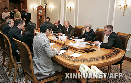資料圖片:2007年6月1日,在俄羅斯首都莫斯科郊外的總統(tǒng)官邸,俄總統(tǒng)普京(右三)在出席八國集團首腦會議前夕接受八國記者聯(lián)合采訪。 新華社/法新
