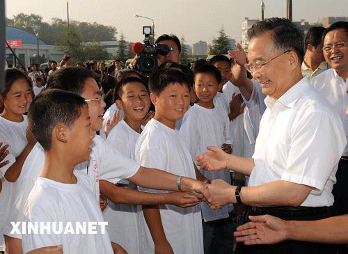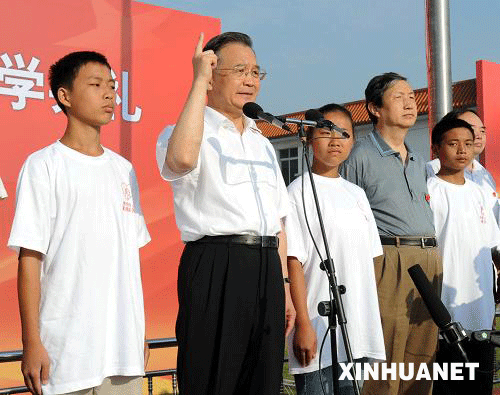 9月1日,正在四川地震災區(qū)考察的中共中央政治局常委、國務院總理溫家寶來到設在四川長虹集團培訓中心的北川中學臨時學校,參加正在這里舉行的秋季開學典禮。新華社記者 黃敬文 攝