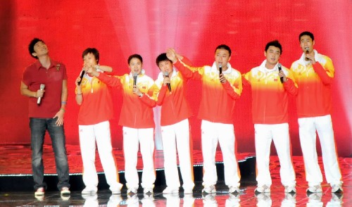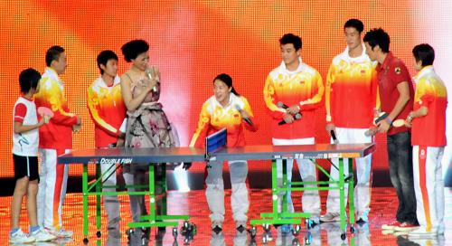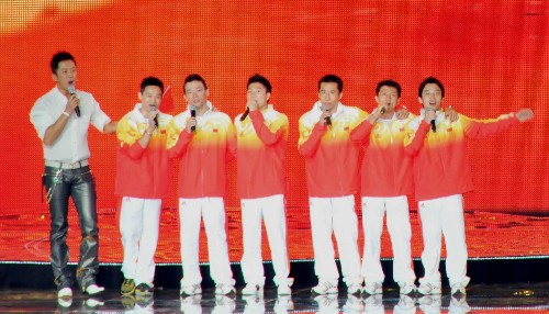主辦方還請來劉歡、那英等內(nèi)地歌星現(xiàn)場高歌,乒乓球隊(duì)和體操隊(duì)的幾位金牌運(yùn)動員在觀眾的強(qiáng)烈要求下獻(xiàn)唱歌曲,將晚會帶入高潮。