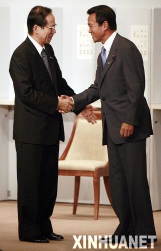 9月22日,在日本東京,福田康夫(左)祝賀麻生太郎當選自民黨新任總裁。當日下午,日本自民黨干事長麻生太郎在自民黨國會兩院議員總會上當選為自民黨新一任總裁。新華社記者任正來攝