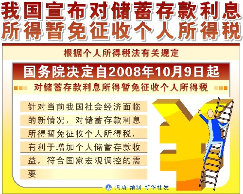新華社北京10月8日電(記者 韓潔、王宇)根據(jù)個(gè)人所得稅法有關(guān)規(guī)定,國務(wù)院決定自2008年10月9日起,對儲(chǔ)蓄存款利息所得暫免征收個(gè)人所得稅。