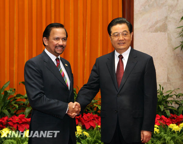 10月23日,中國國家主席胡錦濤在北京人民大會堂會見來華出席第七屆亞歐首腦會議的文萊蘇丹哈桑納爾。 新華社記者劉衛兵攝