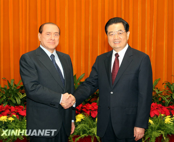 10月23日,中國國家主席胡錦濤在北京人民大會堂會見來華出席第七屆亞歐首腦會議的意大利總理貝盧斯科尼。 新華社記者劉衛兵攝