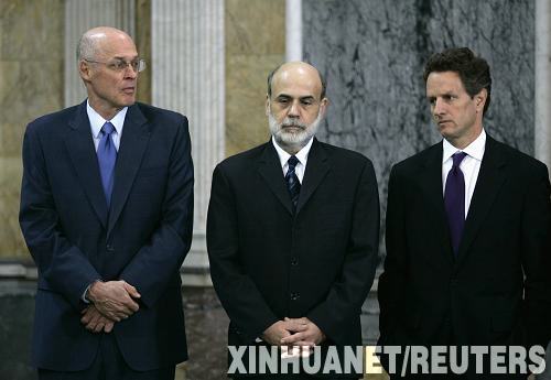蓋特納(右)、伯南克(中)和現任財長保爾森(左)出席財政部新聞發布會的資料照片 新華社/路透 圖