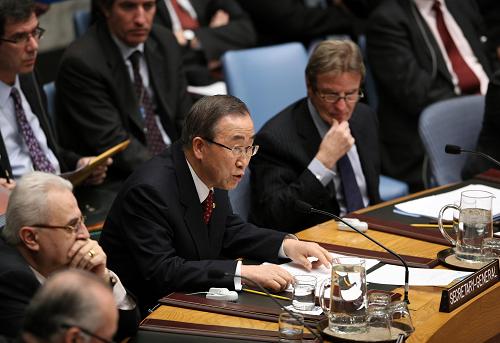 1月6日,在美國紐約聯合國總部,安理會召開會議磋商加沙危機,聯合國秘書長潘基文(中)在會議上發言。新華社記者侯俊攝