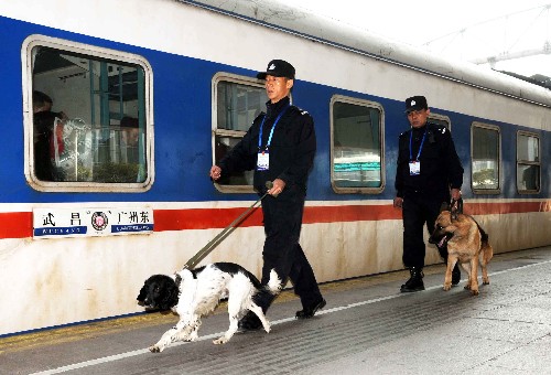 1月8日,兩位鐵路民警帶著搜爆犬在廣州火車站站臺上巡邏。 目前,廣州鐵路警方已提前進入春運安全保衛狀態,利用4條搜爆犬24小時在廣州火車站進行搜爆巡邏,確保春運安全。 新華社發(丁勇 攝)