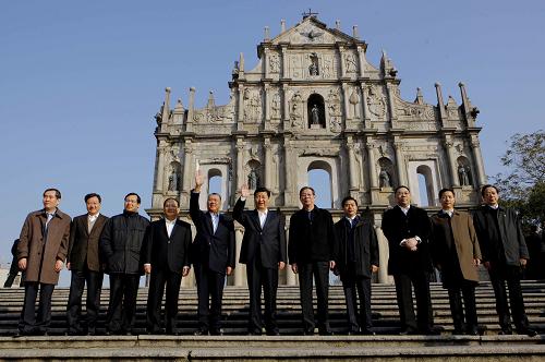 1月11日,國家副主席習近平到澳門著名文化遺址大三巴參觀。這是參觀后習近平與澳門特別行政區行政長官何厚鏵(左五)等合影。新華社記者 周磊 攝