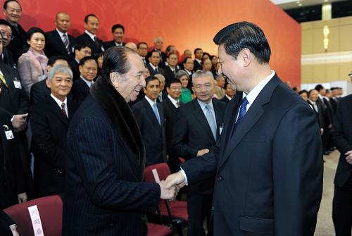 1月10日,國家副主席習近平在澳門東亞運動會體育館禮堂親切會見澳門社會各界代表人士。這是習近平和全國政協常委何鴻燊握手。新華社記者 馬占成攝