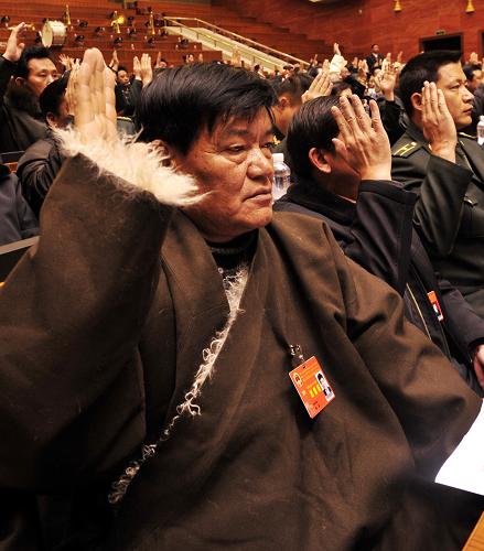 1月19日,西藏自治區人大常委會主任列確宣布,與會的382名代表一致表決通過了《西藏自治區人民代表大會關于設立西藏百萬農奴解放紀念日的決定》。 當日,西藏自治區九屆人大二次會議決定,將每年的3月28日設為西藏百萬農奴解放紀念日。新華社記者 格桑達瓦 攝
