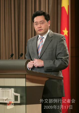 2009年3月17日下午,外交部發言人秦剛主持例行記者會,就朝鮮總理訪華、六方會談、巴基斯坦政局等回答記者提問。