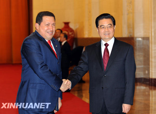4月8日,國家主席胡錦濤在北京人民大會堂親切會見來華進行工作訪問的委內瑞拉總統查韋斯。新華社記者 馬占成 攝