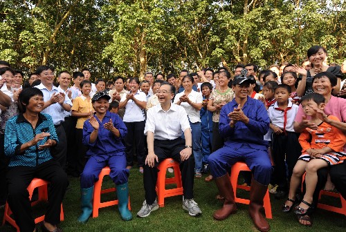 聽說總理來到了農場,職工們紛紛聚攏過來。在橡膠林旁一塊空地上,總理與大家圍在一起嘮起家常。溫家寶說,看到農場面貌變了,職工生活好了,人心順了,我十分高興。住房、教育、醫療、養老……總理與大家的交流實實在在,不時傳出陣陣笑聲和掌聲。