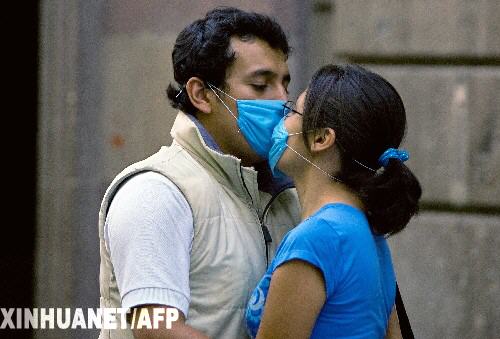 4月25日,在墨西哥首都墨西哥城,一對情侶戴著口罩接吻。墨西哥衛生部官員何塞·科爾多瓦當日通報說,截至24日晚間,墨西哥共有20人直接因感染豬流感病毒死亡,全國疑似病例達4000余人。 新華社/法新